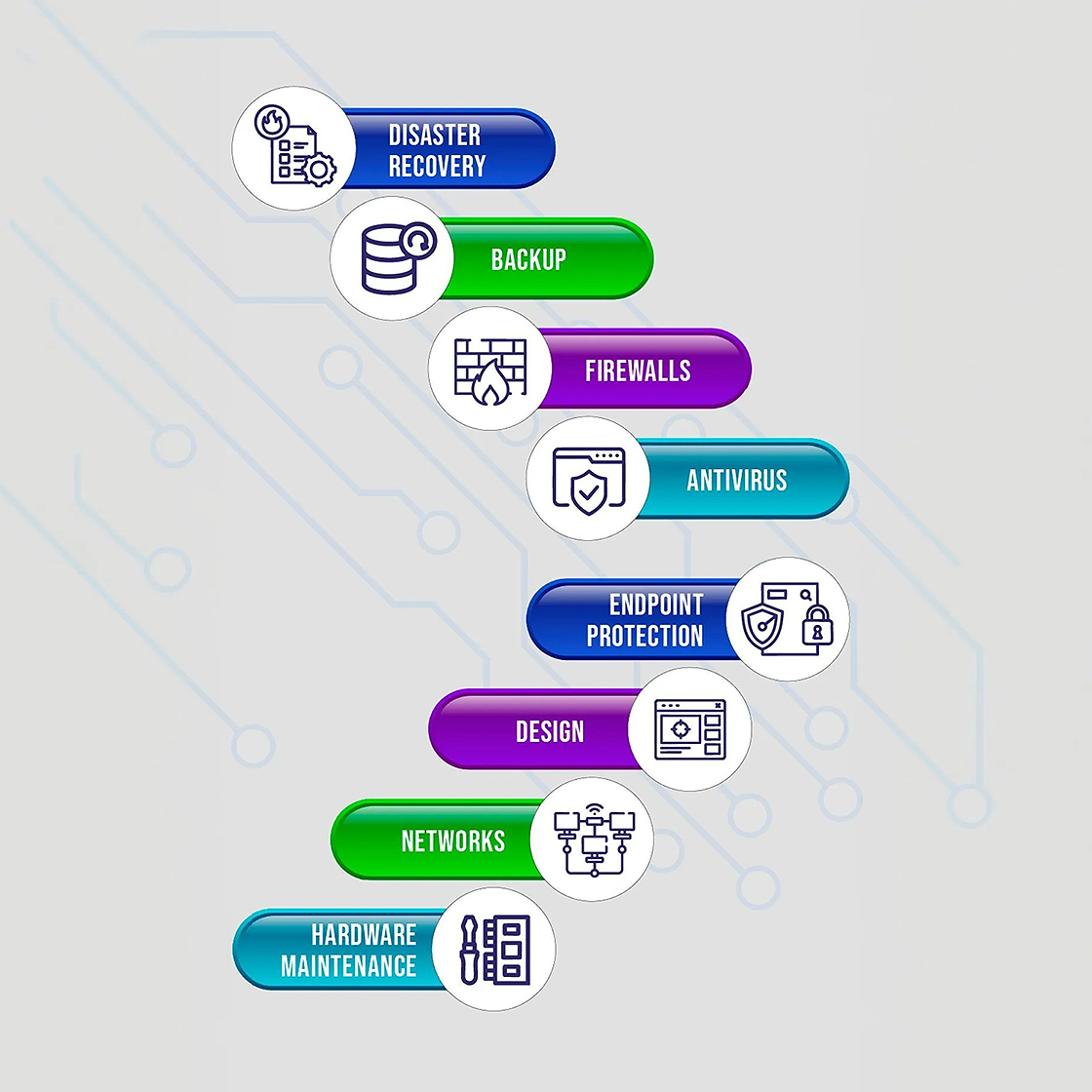 Backup, disaster recovery, Firewalls, antivirus, endpoint protection, Design, setup, management of networks, and Hardware Maintenance